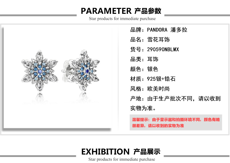 潘多拉PANDORA 925银+锆石结晶雪花耳饰 290590NBLMX (领取商品现金券)