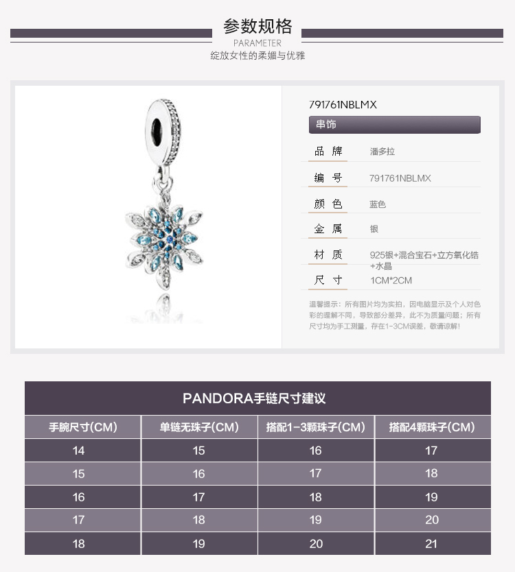 首页> 轻奢品> 配饰摆件> 吊坠> 潘多拉PANDORA 闪耀冰蓝锆石雪花吊坠 791761NBLMX